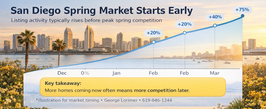 George Lorimer at 619-846-1244 Here’s what changes in San Diego starting mid-January: buyers come back fast, inventory rises more slowly, and the market speed picks up week by week. This is the “Winter Market” window (mid-Jan ? mid-Mar). On the call, I’ll give you a simple plan for your timeline (buying, selling, or both) — and I’ll tell you what I’d do if it were my money. Most people make the same mistake: they rely on an online estimate or last year’s sale and assume it applies today. It doesn’t. What matters is what buyers are willing to pay right now, not what they can buy this weekend. Free Reports (fast + actually useful): Not Just an Online Estimate — Real home value + (optional) instant cash offers. Your Home Value through a Buyer’s Eyes — pricing like pros + buyer objections + what to fix (and what not to). Request the Buyer’s Eyes version (or call/text 619-846-1244) What Buyers Are Paying (Real Numbers) — the gap between list price and reality, plus what’s getting discounted. Sellers: Buyers: Homes with 2–3% assumable mortgages — this can save thousands per year vs today’s rates. See the assumable list (text me “ASSUMABLE” for the newest options) Don’t compete with other buyers — request unlisted / off-market homes in your preferred neighborhood. Request off-market access (or text me: neighborhood + price range) Active Homes + Competing Neighborhoods — the simple lens that helps sellers maximize price and get it sold. Get my free report: Your Home Value through a Buyer’s Eyes right here. Here’s the deal: most people wait until Spring and then wonder why it feels stressful and expensive. If you want a calmer, smarter path — get the numbers now and choose your window on purpose. Call/Text George Lorimer: 619-846-1244 ProWest Properties, DRE# 01146839. Your Home Sold Guaranteed or I’ll Buy It!* *Conditions apply. Disregard if currently listed for sale.